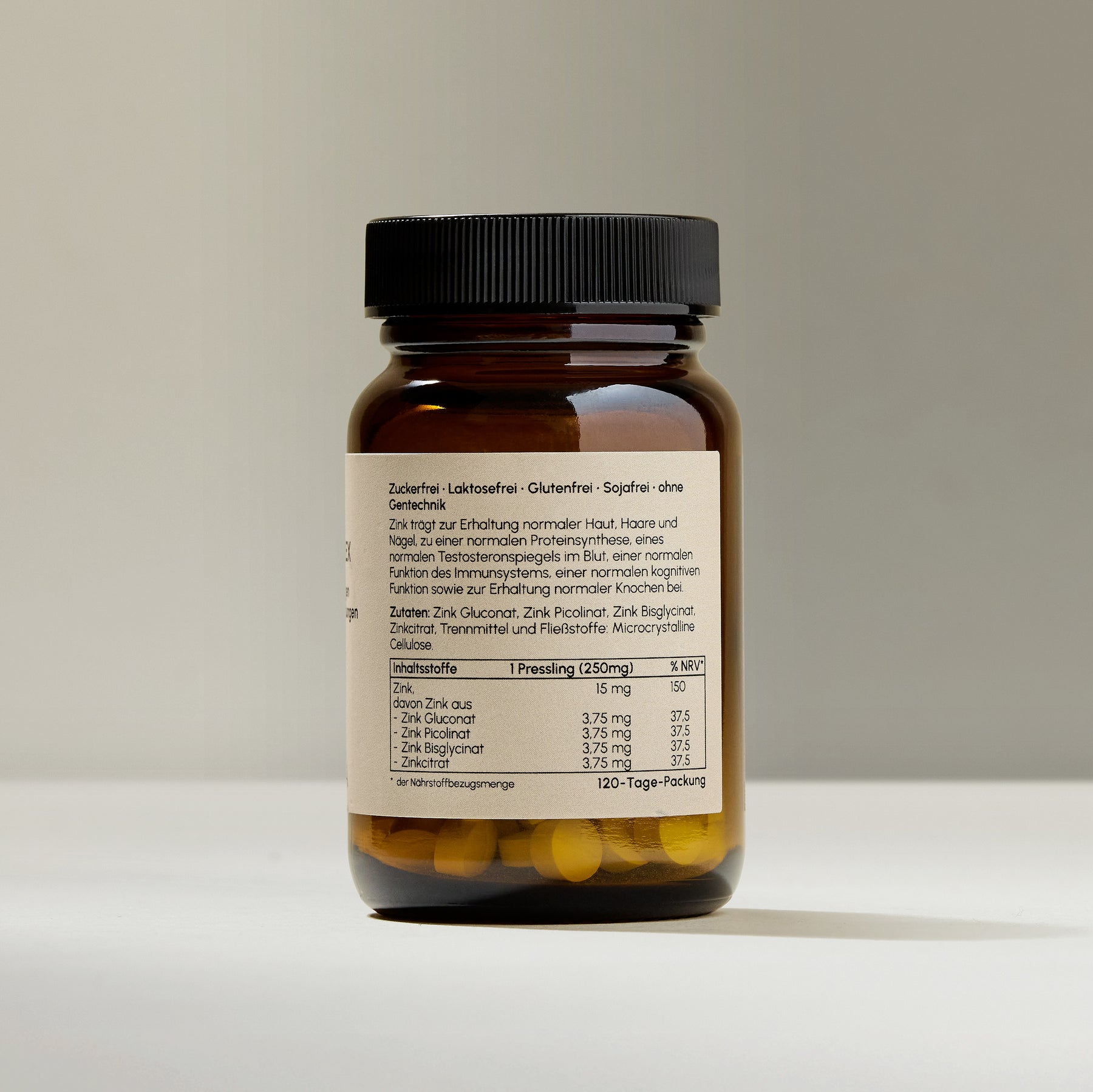 Zutaten: Zink Gluconat, Zink Picolinat. Zink Bisglycinat, Zinkcitrat. Trennmittel und Fließstoffe: Microcrystalline Cellulose.